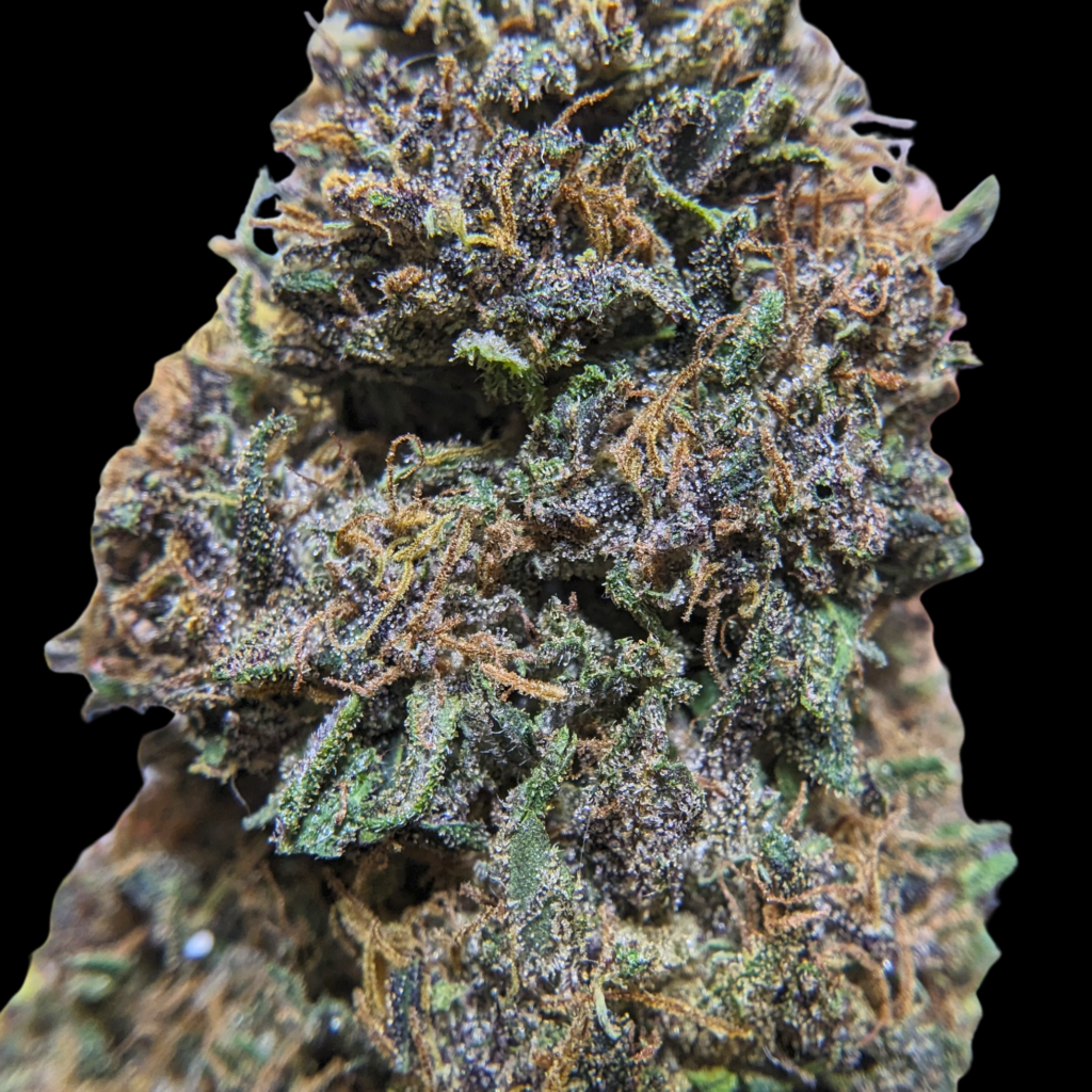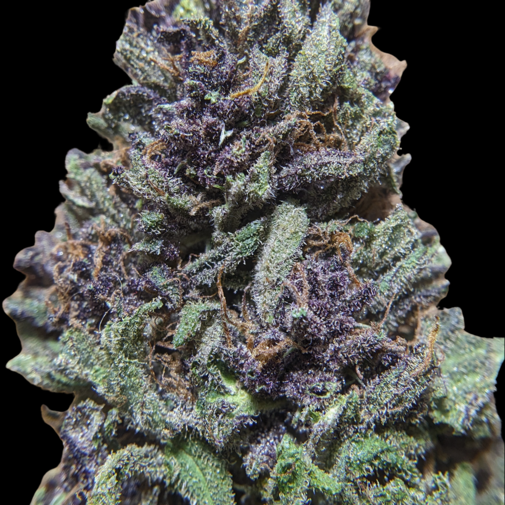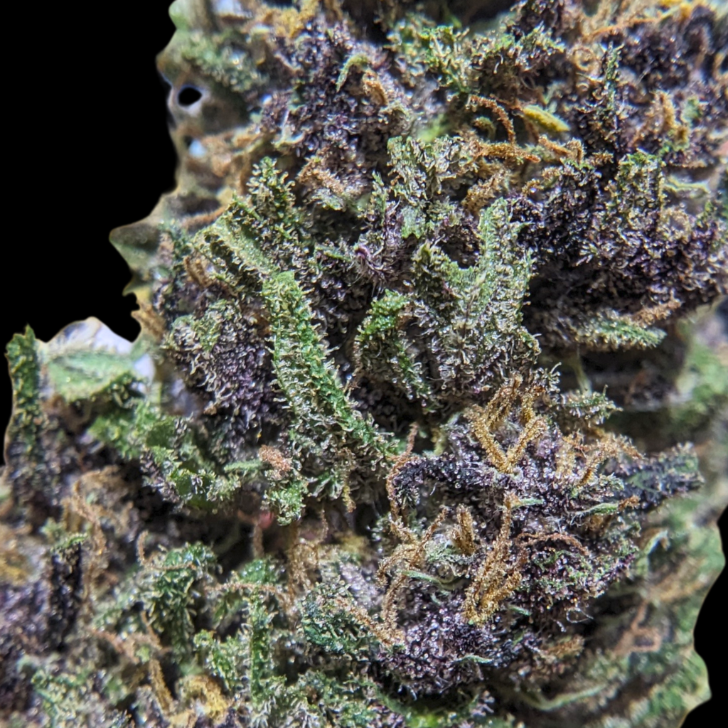 Jolies buds, moyennes et grosses, moelleuses, denses, bien violettes avec quand même le vert des feuilles coupées. Les trichomes sont bien présents, ambrés, des glandes laiteuses, c’est manucuré comme la précédente.