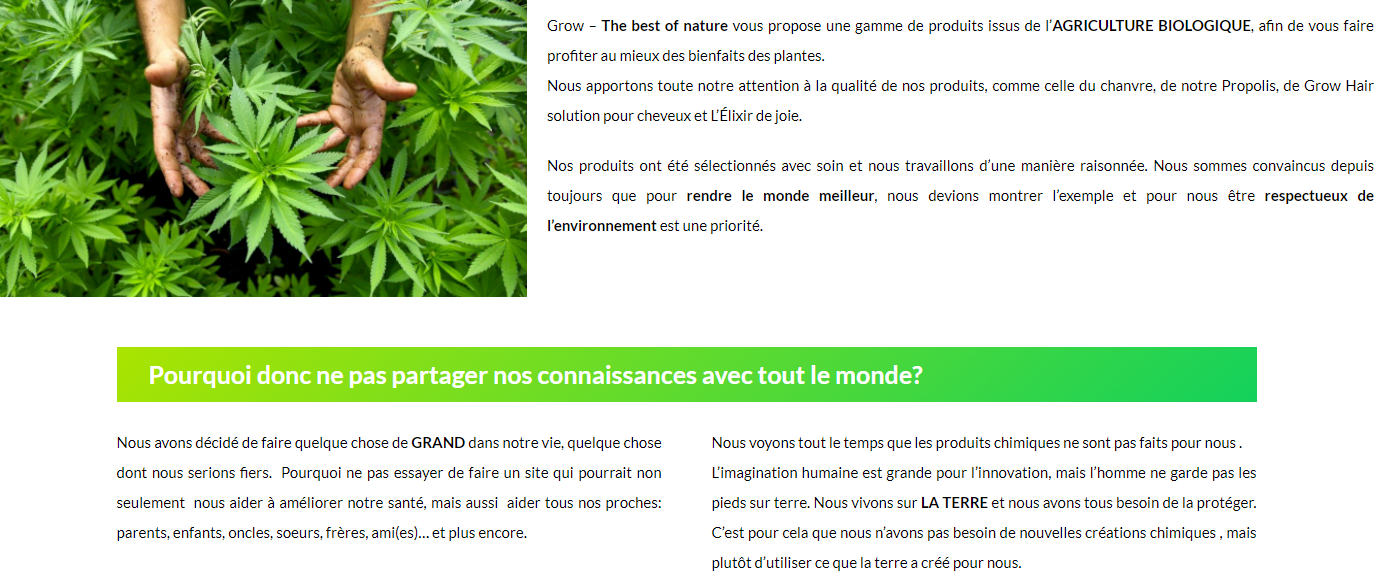 Grow – The Best of Nature offre une sélection de produits de qualité issus de l’agriculture biologique. Les bienfaits des plantes sont au cœur de leur démarche, que ce soit à travers le chanvre, la propolis, la solution capillaire Grow Hair, ou l’Élixir de Joie. La sélection minutieuse de leurs produits témoigne de leur engagement envers la qualité, tout en adoptant une approche raisonnée.