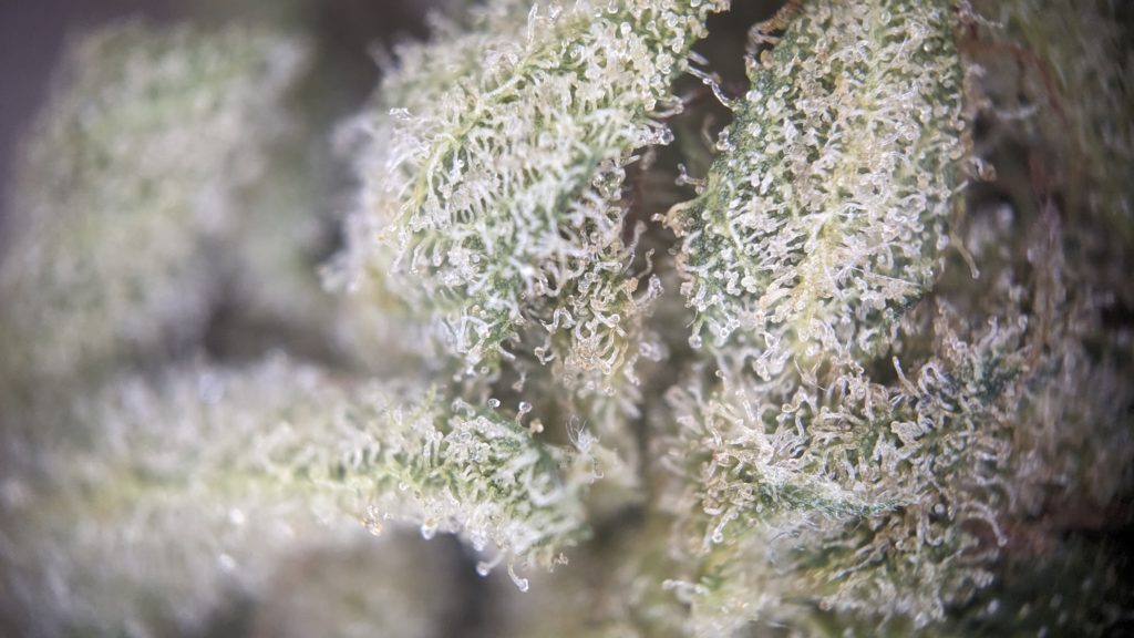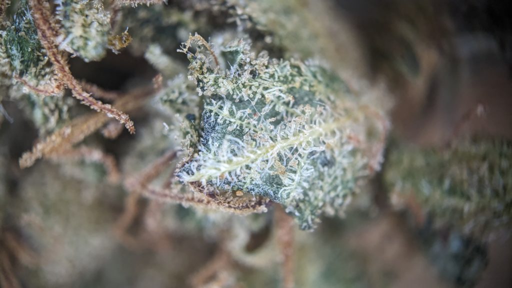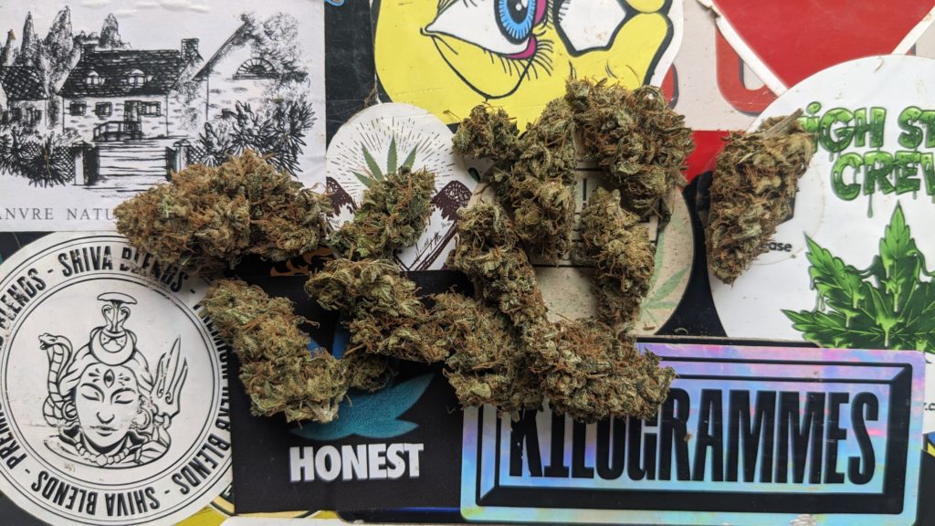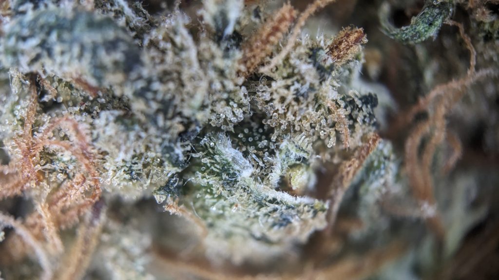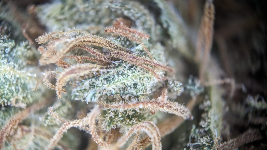 Les têtes sont belles, petites, moyennes, bien vertes, pleines de trichomes ambrés et de glandes laiteuses. C’est un peu dense, bien manucuré, pas trop, c’est moelleux, craquant. RAS.