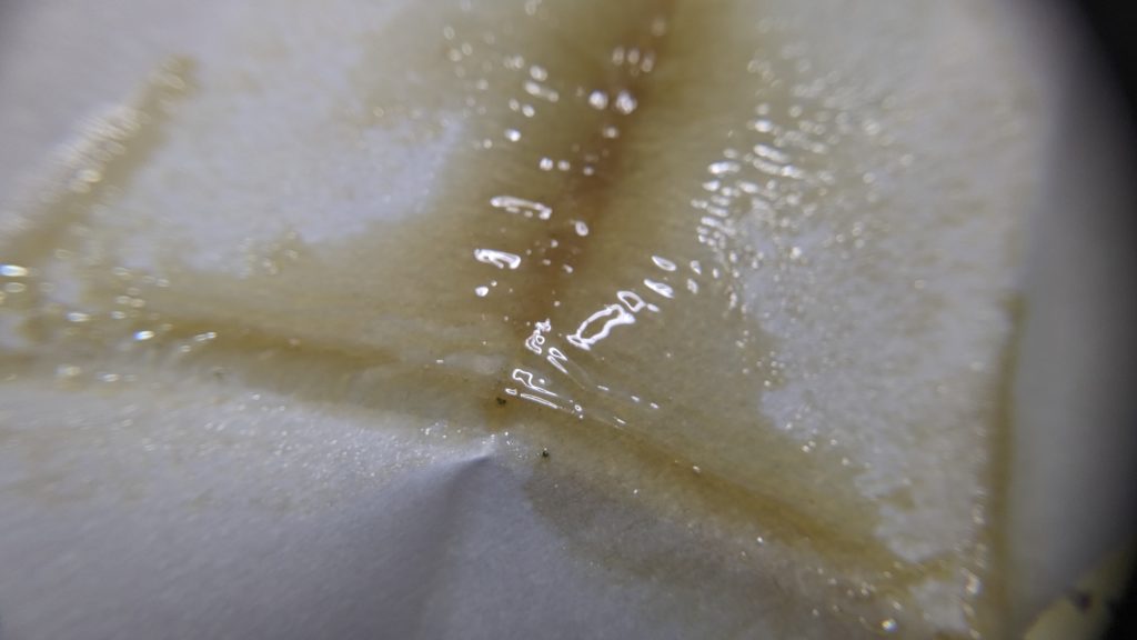 Visuellement c’est joli hein, sorti du frigo on dirait presque un bout de shatter ou proche haha. Pour les fanatiques, on peut évidemment faire plus propre, l’échelle de clarté et de translucidité sur certaines extractions est sans limites…
