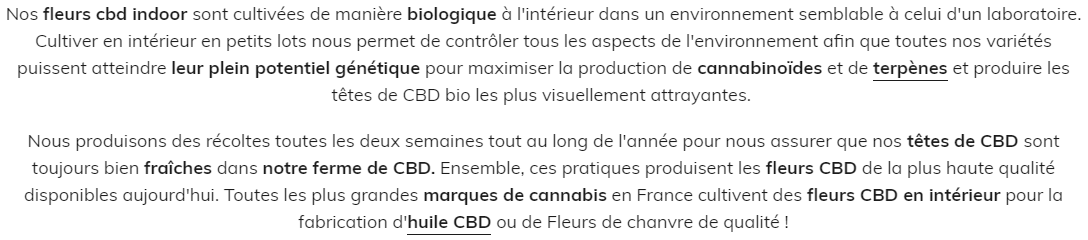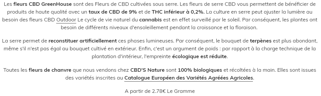 Chez CBD’S NATURE, on propose une variété de fleurs de chanvre CBD de haute qualité adaptées à différents budgets. Ils offrent des fleurs CBD cultivées en extérieur de manière naturelle, des fleurs de serre CBD exposées à la lumière naturelle du soleil, et des fleurs CBD d’intérieur qui sont bien soignées. Cette variété permet à chacun de trouver un produit qui lui convient en termes de qualité et de prix.