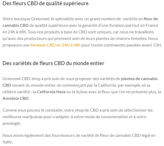 La boutique GreenOwl propose une variété de fleurs de CBD de qualité, avec une livraison rapide en France sous 24 à 48 heures pour les commandes passées avant 13h en semaine. Les produits proviennent de producteurs attentifs à leurs cultures de chanvre. GreenOwl offre une sélection internationale de variétés de cannabis CBD, y compris des variétés renommées comme la California Haze de Californie. La boutique s’efforce de répondre à différents modes de consommation et posologies en sélectionnant soigneusement ses produits, y compris des variétés légales en provenance d’Italie.