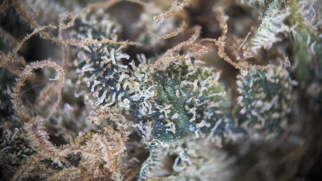 La tête est bien jolie, pas trop grosse, bien claire de glandes mi laiteuses mi ambrées, les trichomes sont eux ambrés et très présents.