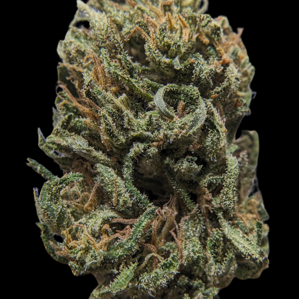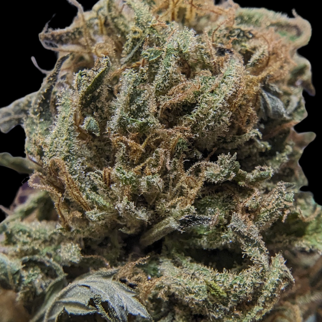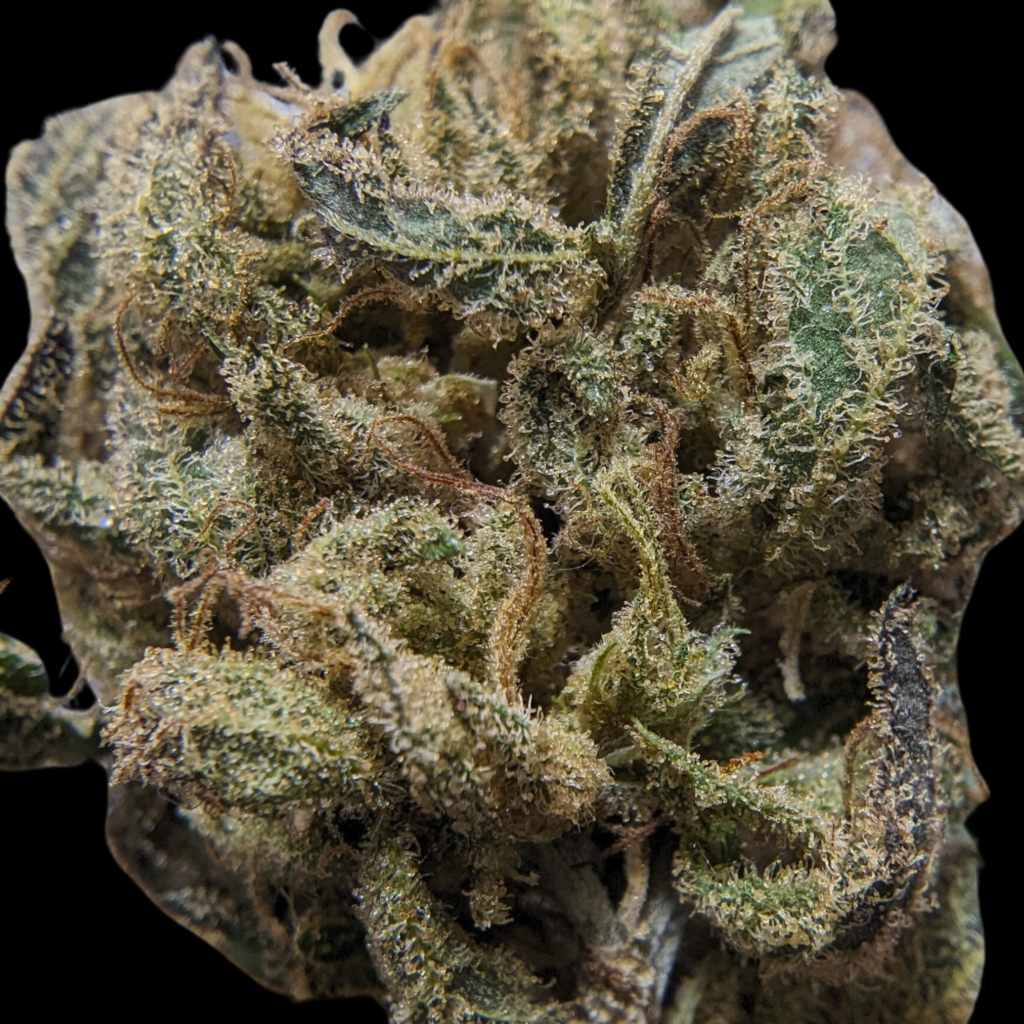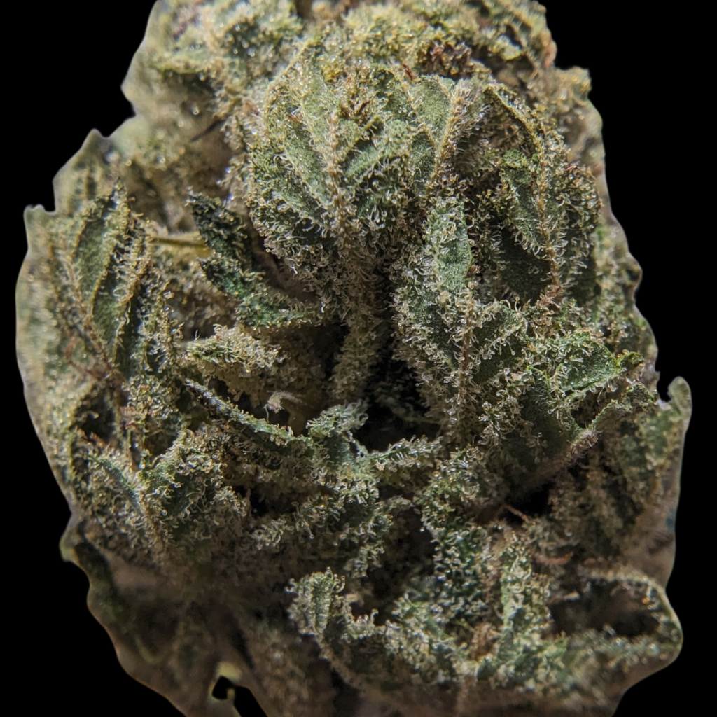 Belle tête de moyenne taille, bien verte et dense mais avec des endroits bleutés, violets. C’est mieux manucuré que sur les autres jusque là. C’est moelleux, fraichement sec, les trichomes orangés sont présents, les glandes surtout laiteuses.