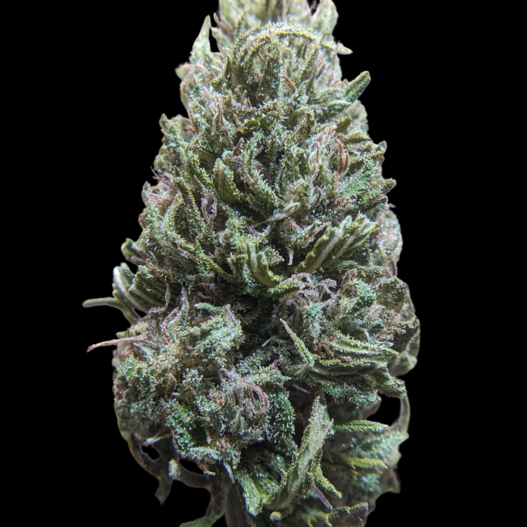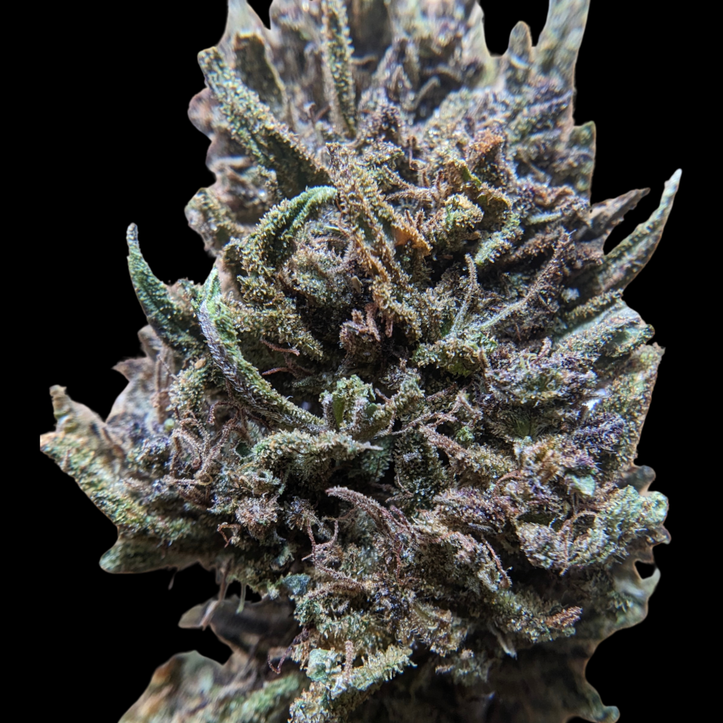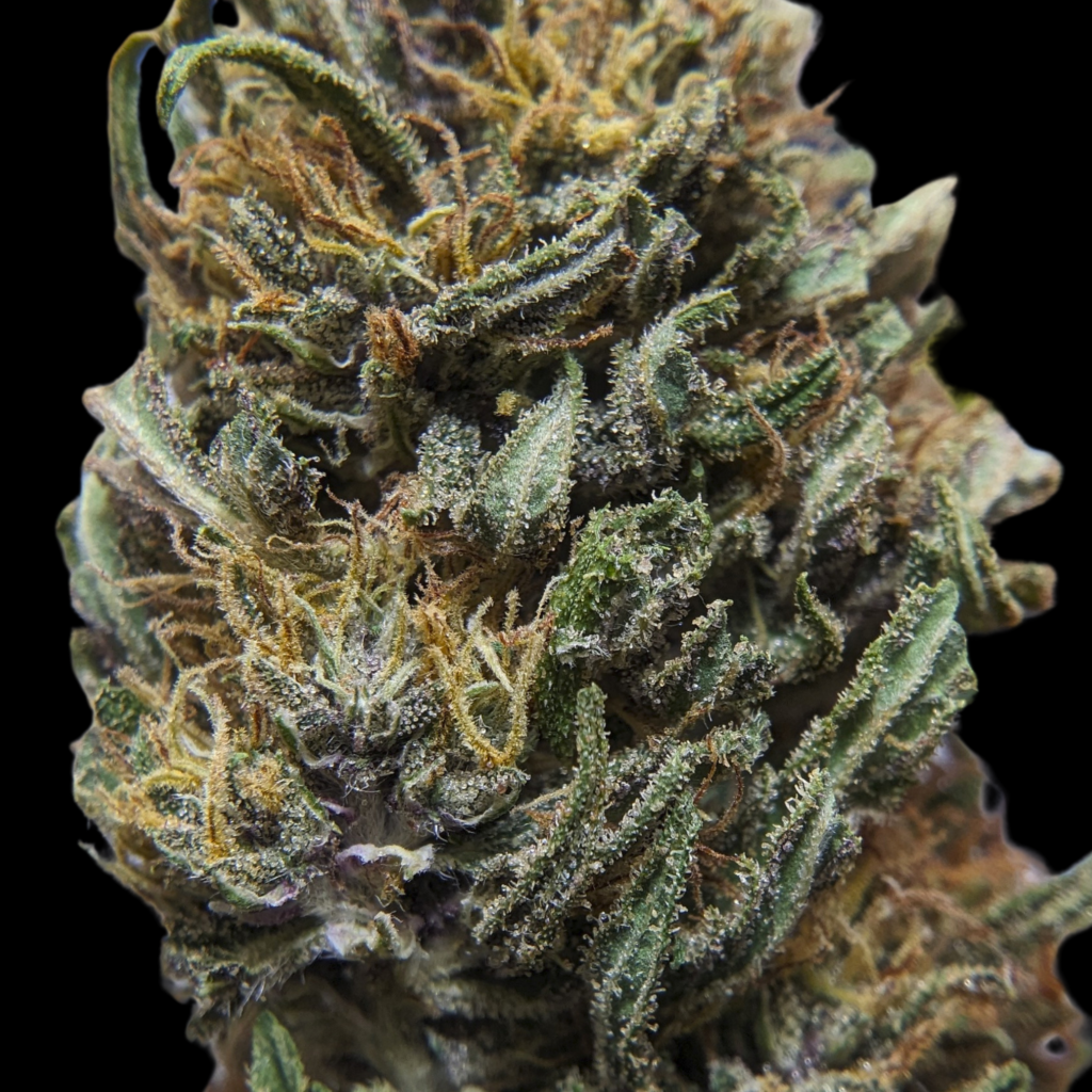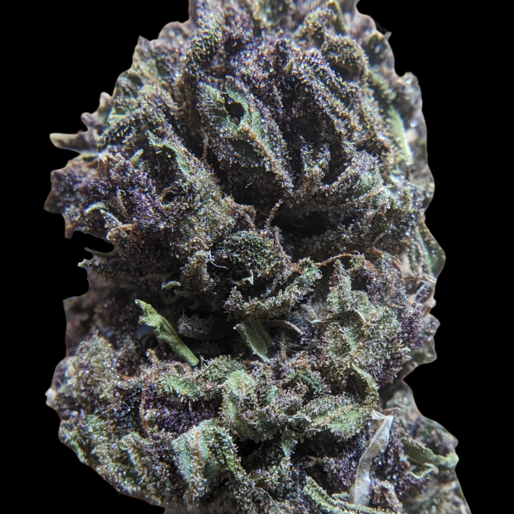 La tête est surtout violette, bien foncée, verte, dense. C’est manucuré léger comme d’hab, les trichomes sont discrets mais présents et orangés, les glandes mi ambrées mi laiteuses.