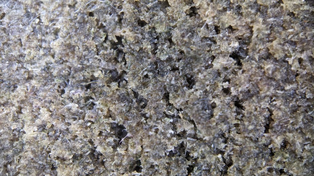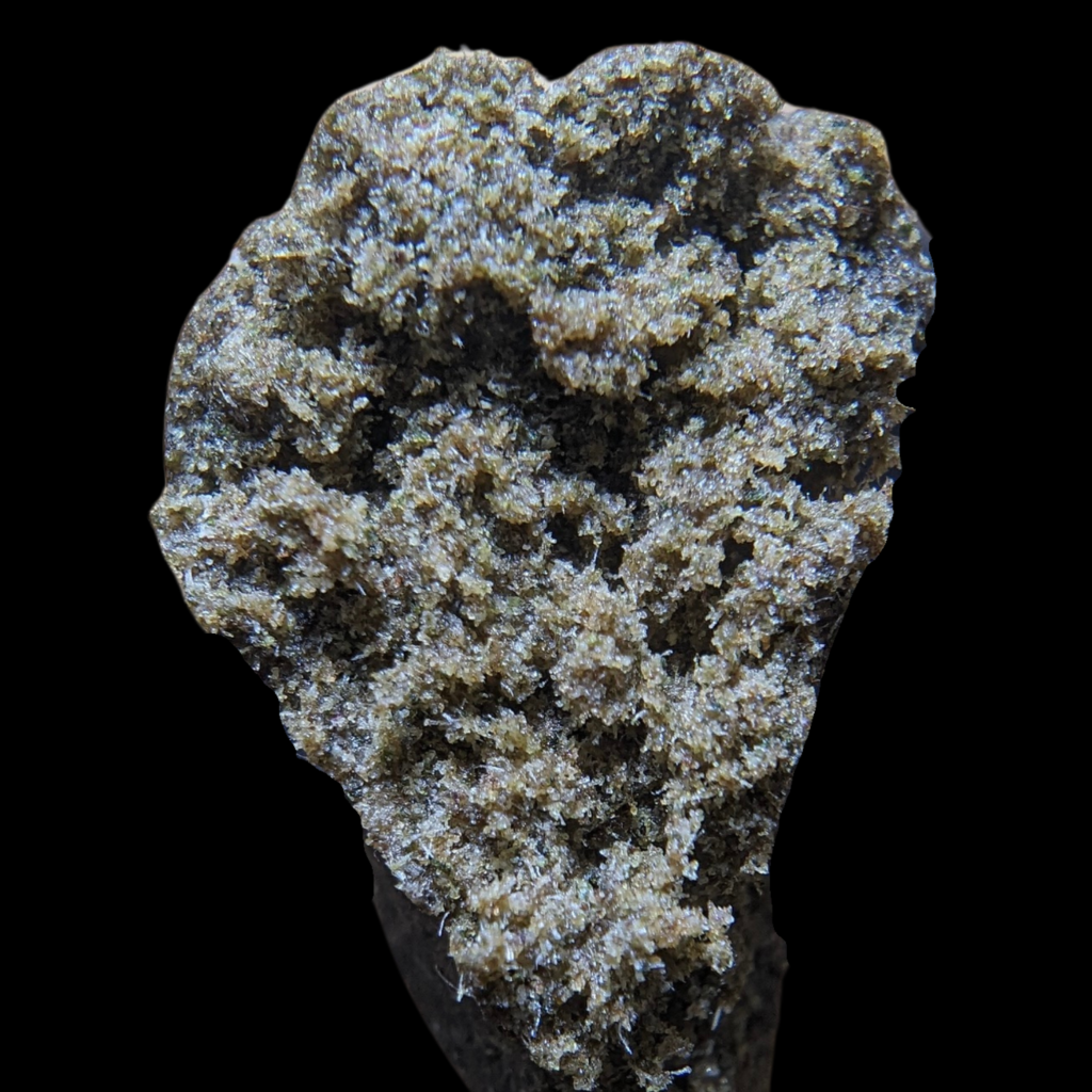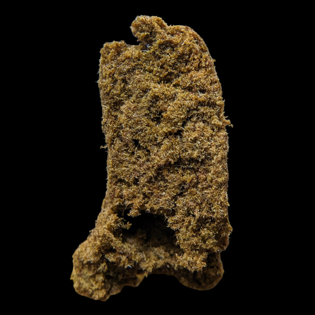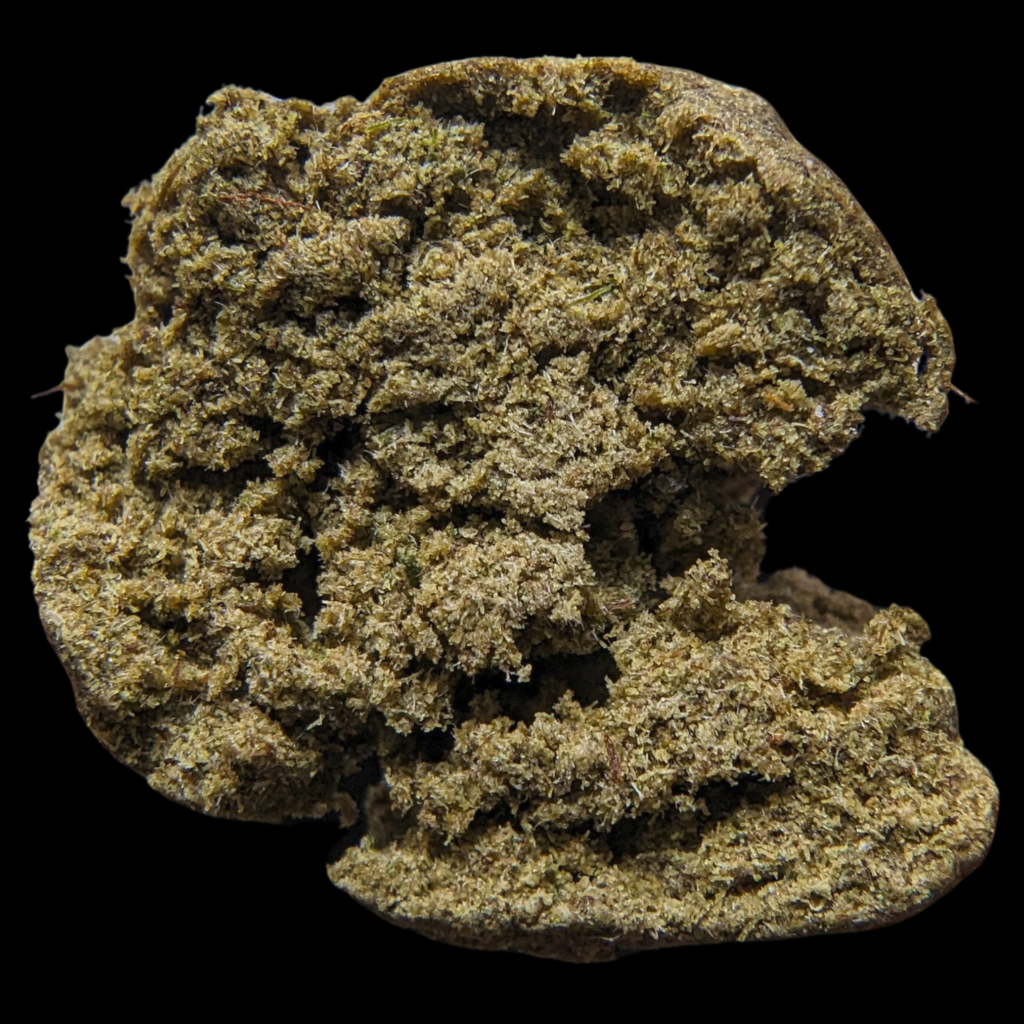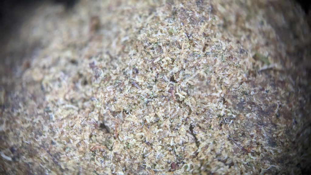 C’est un hash pas trop foncé ni trop clair, assez régulier à la loupe, bel amas de glandes laiteuses et ambrées. Il colle quand même légèrement aux doigts niveau texture. RAS.