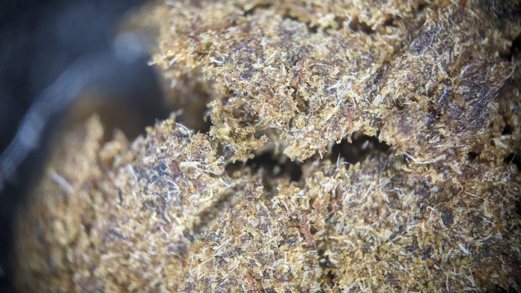 Un joli marron ambré, mi sec mi gras au toucher, mais pas collant. Il est plutôt régulier et mignon à la loupe, de la glande ambrée, laiteuse, quelques trichomes. RAS.