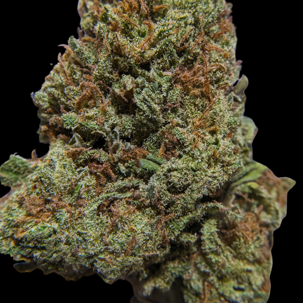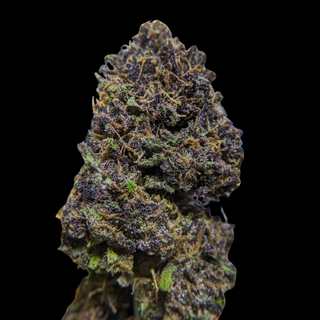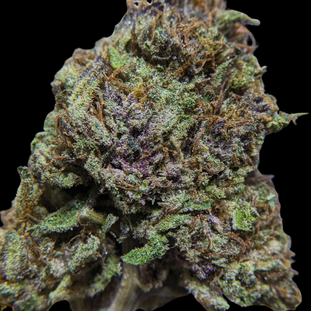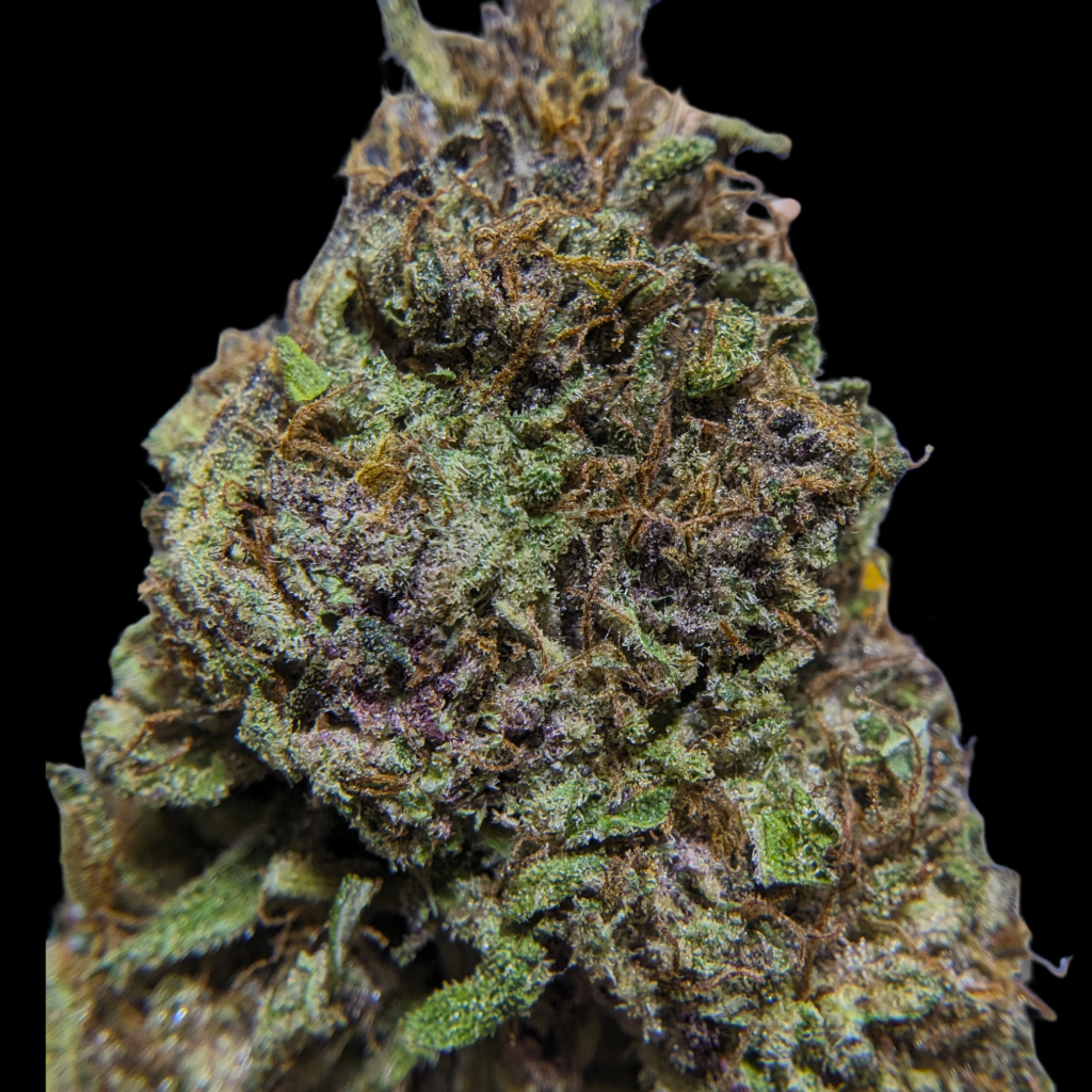 Tête assez grosses, ou plutôt longues, bien denses, violettes, un peu vertes, des trichomes ambrés de partout, des glandes laiteuses. La manucure est bien serrée, et bien qu’elle soit dense, elle a du moelleux, ça craque pas trop.