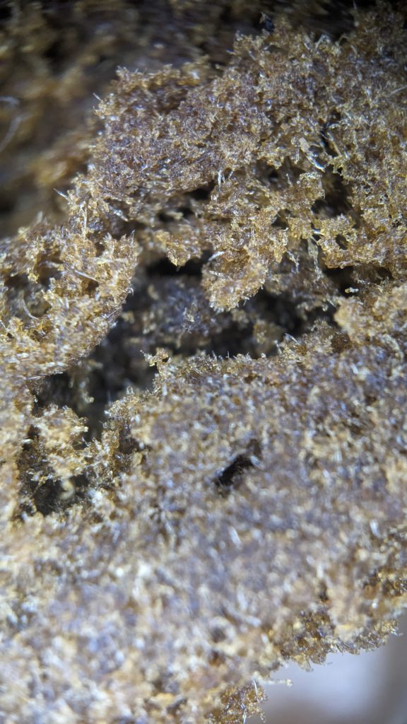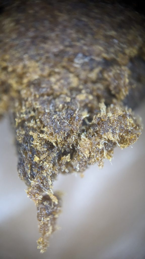 Fruits tropicaux, ananas, rance, vomi, c’est les notes qui me viennent en premier. Le hash est gras, un peu collant, foncé. Il est beau. Bien brillant et fondant à la loupe !