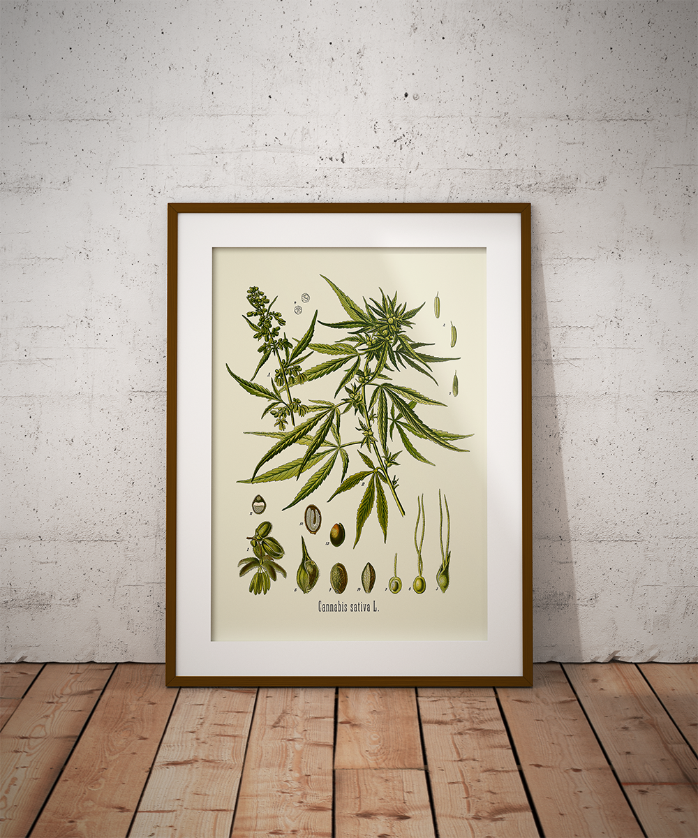 Ajoutez une élégance intemporelle à votre décoration avec ces affiches botaniquse de qualité supérieure. Inspirée des planches naturalistes du XIXe siècle, ces illustrations du Cannabis sativa L. détaille avec une précision d’orfèvre l’anatomie de la plante : feuilles, graines et fleurs y sont représentées dans un style gravure classique.