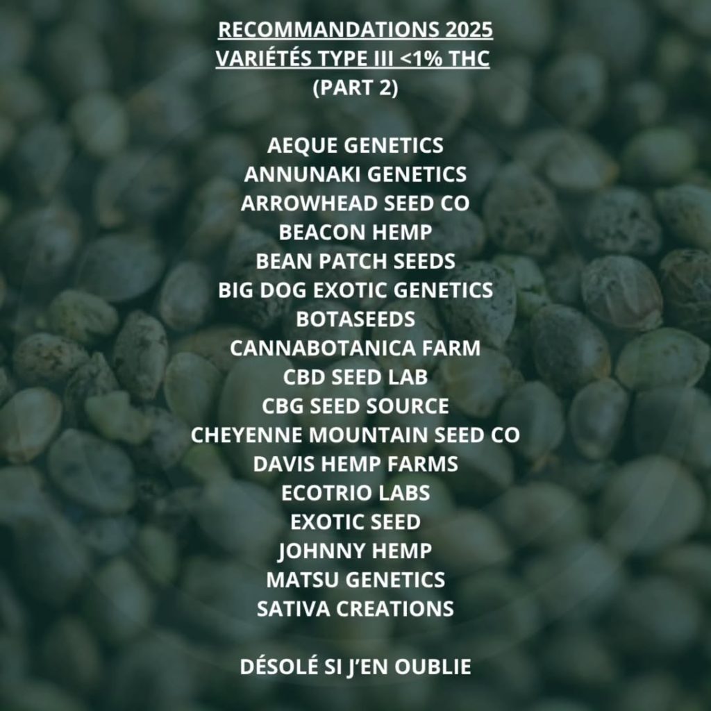 Je vous liste déjà depuis quelques années maintenant, toutes les banques, breeders et généticiens qui font des génétiques et des graines de variétés étant à <0.3% de THC ou <1% de THC.