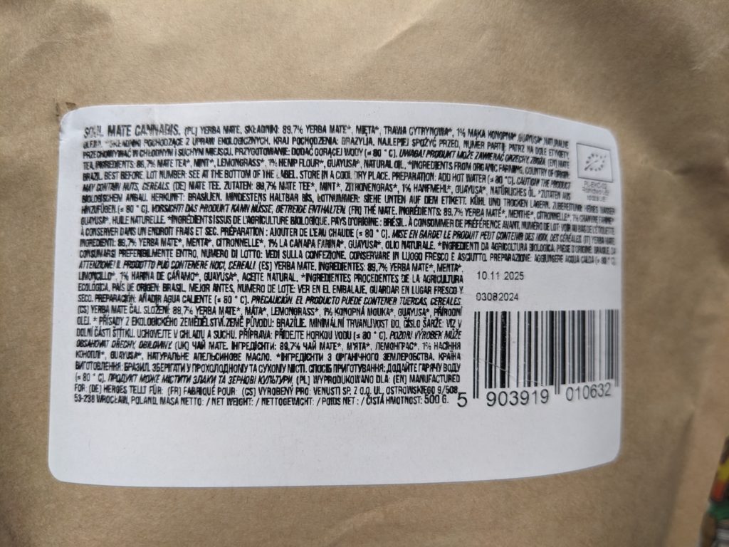 Organique cannabis : 89.7% yerba mate, menthe, citronnelle, 1% farine de chanvre, guayusa, huile naturelle