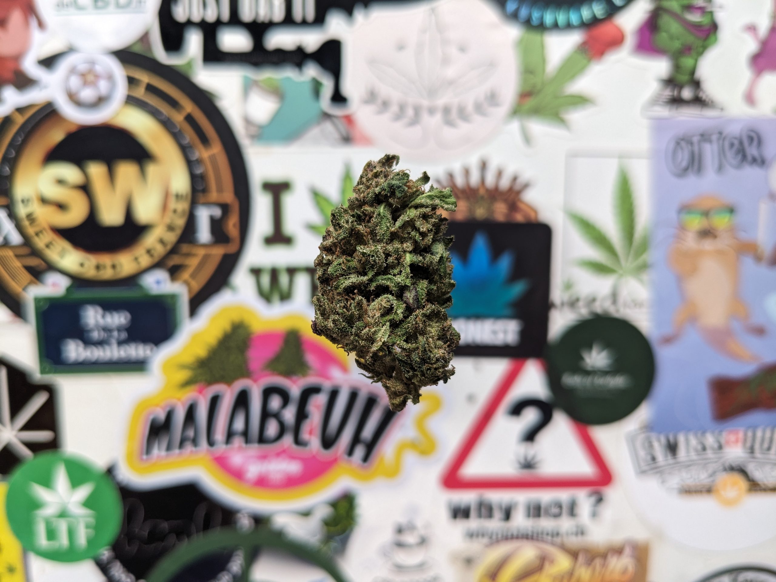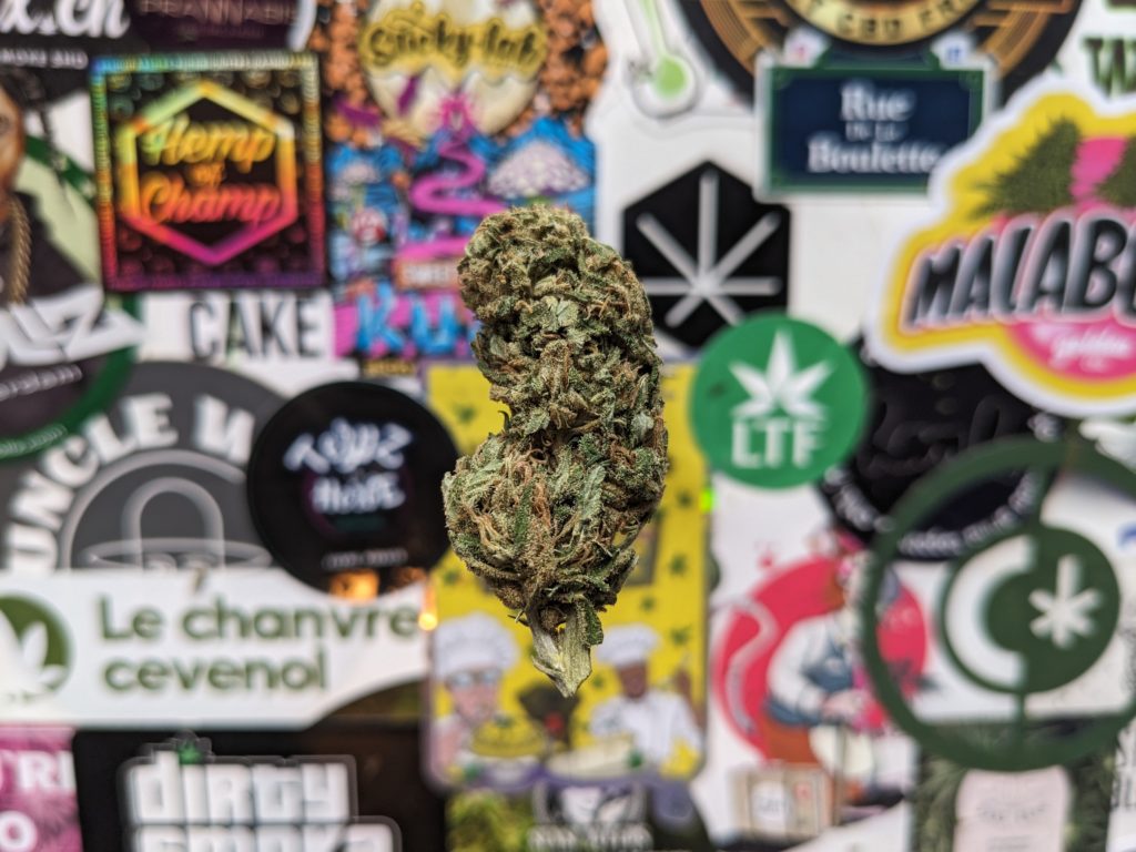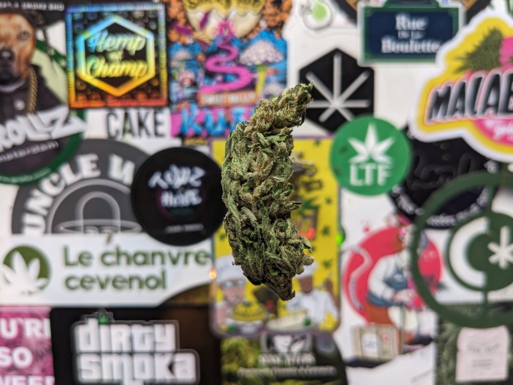 Une tête allongée et verte, un peu tordue par le voyage, elle est encore bien moelleuse, un peu dense. Les trichomes sont ambrés et présents mais assez discrets. Les glandes surtout laiteuses. Elle a des tons de souffre un peu cheesy qui se précisent une fois grindée.