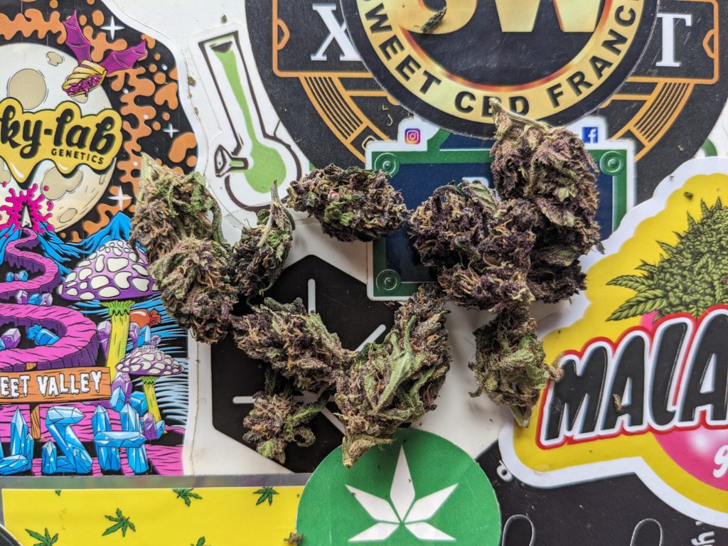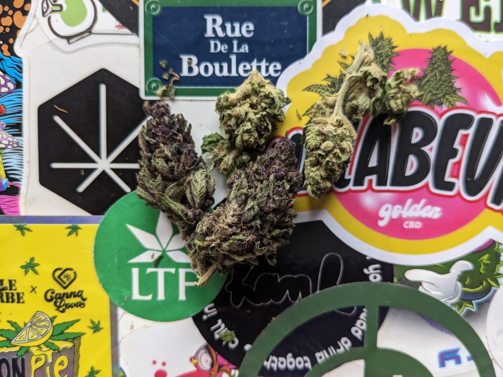 Du gaz et un côté fruité/baie noire dès l’ouverture. Raisin peut être ? Cassis ? Mûre ? Les têtes suivent la tendance des précédentes, allongées, aérées, petites, violettes, vertes. Les trichomes sont présents, ambrés et les glandes surtout laiteuses.