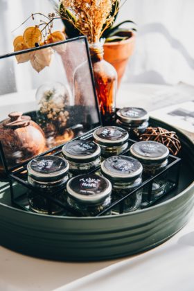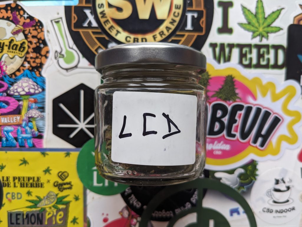 Une tête de bonne taille, assez verte et un peu dense. Dès l’ouverture et autour de la bud, ça sent comme une moutarde au miel. Ça change ! Elle est manucurée légèrement, elle a de beaux trichomes ambrés et des glandes surtout laiteuses.
