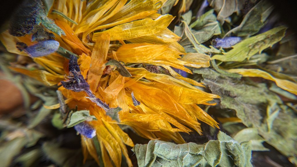 Rien qu’à la liste d’ingrédients et le visuel à travers le sachet, je sais que je vais me régaler. J’ouvre, ça sent bon, j’arrive bien à détecter tous les ingrédients, pas pour rien que sont recommandés 4-5 ingrédients max dans une infusion ! L’infusion est produite par la compagne d’Elie, à laquelle est ajouté le chanvre de Vercors Sativa.